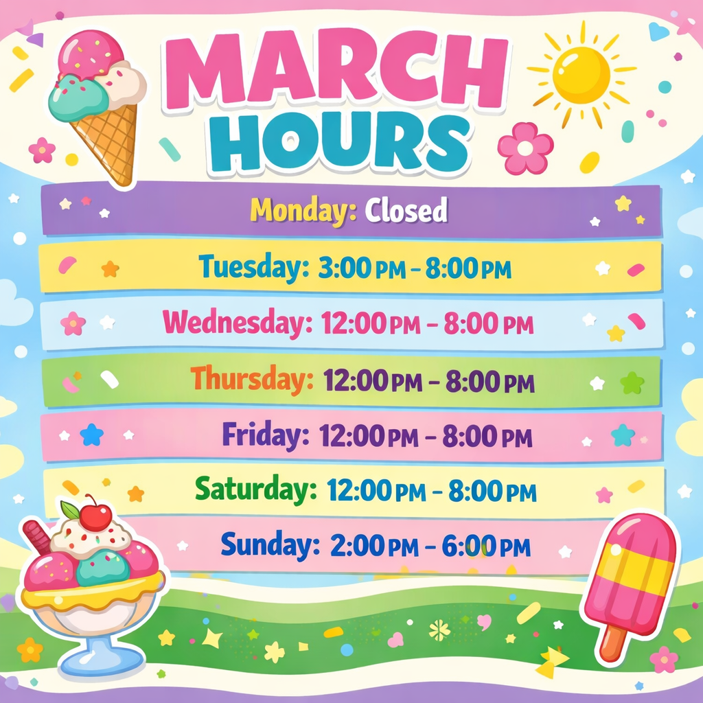 Come take a breather and enjoy some delicious super premium ice cream in our adorable store front. Bring a friend and enjoy the smell of our fresh made waffle cones.